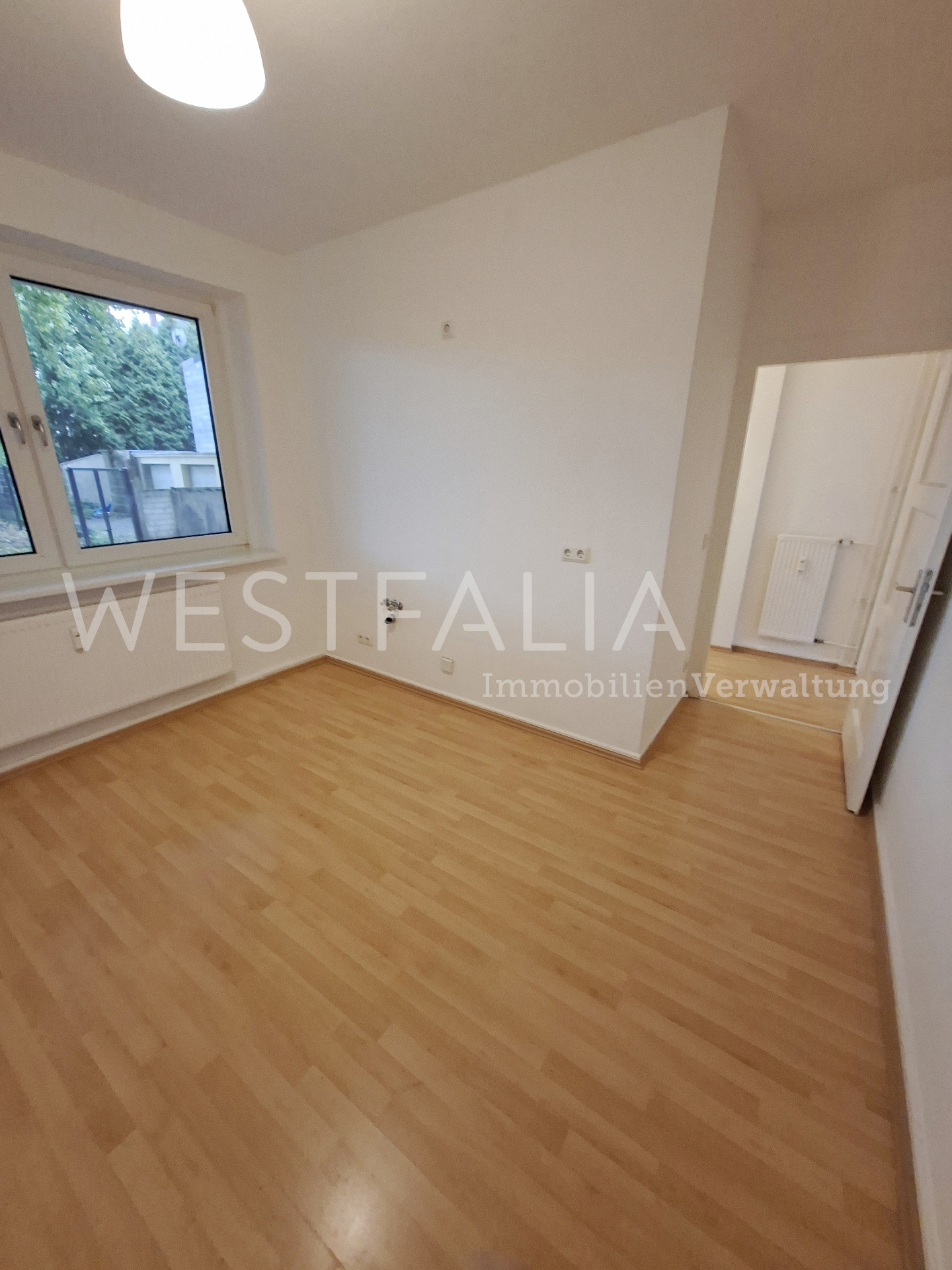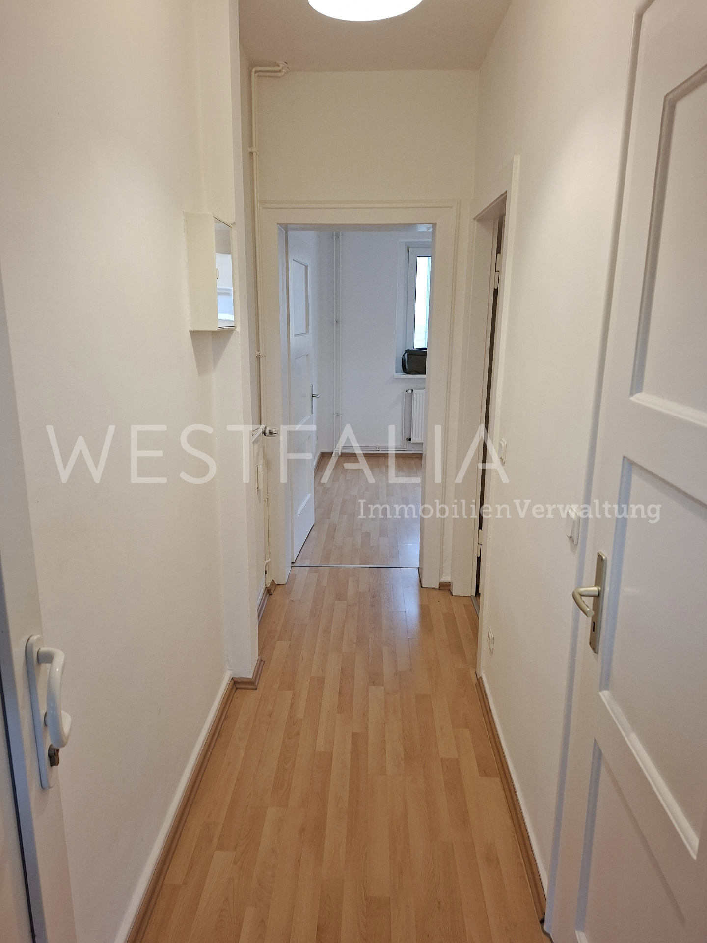 In der gesamten Wohnung ist ein heller Laminatboden verlegt, der für eine moderne Wohnatmosphäre sorgt.